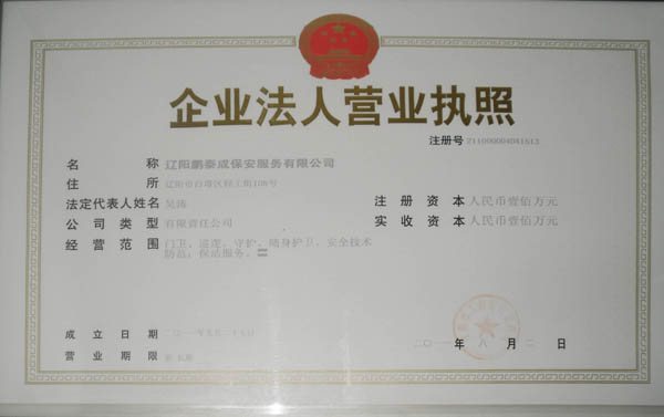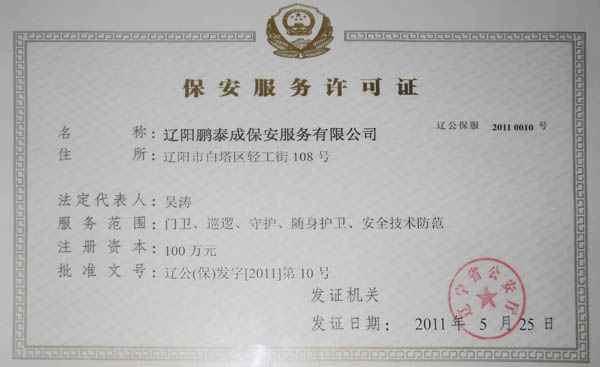 遼陽(yáng)鵬泰成保安服務(wù)有限公司成立于2011年6月,是經(jīng)省公安廳及遼陽(yáng)市公安局批準(zhǔn),市工商局審批注冊(cè),并在遼陽(yáng)市公安局指導(dǎo)下成立的正規(guī)集團(tuán)公司。2015年納入公安局“天眼五護(hù)工程”試點(diǎn)單位。